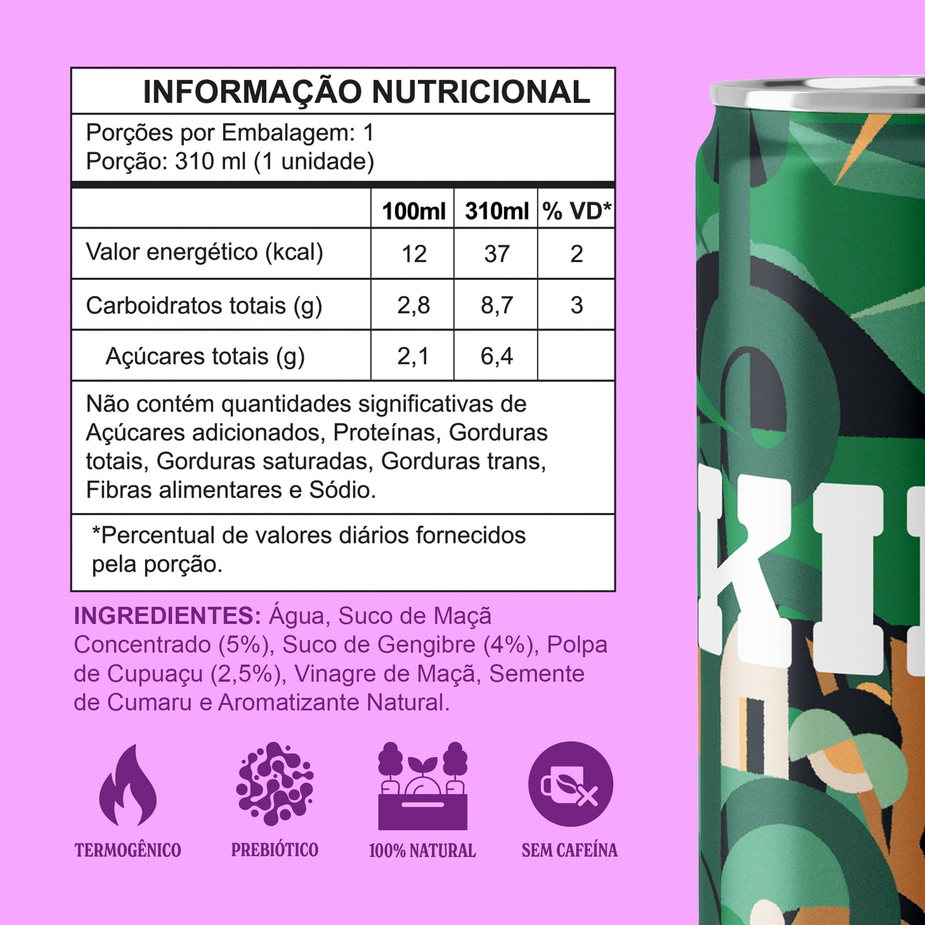 INGREDIENTES: Água, Suco de Maçã, Suco de Gengibre, Vinagre de Maçã, Polpa de Cupuaçu, Semente de Cumaru e Aromatizante Natural.
